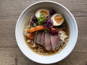 Tare shoyu, bulion klarowny z gęsi, olej z czosnku niedźwiedziego z rozmarynu i borowika, pierś z gęsi sous vide,cebulka karmelizowana na czerwonym winie , dżem z wiśni, blanszowana marchewka, szczypior, jajko nitamago